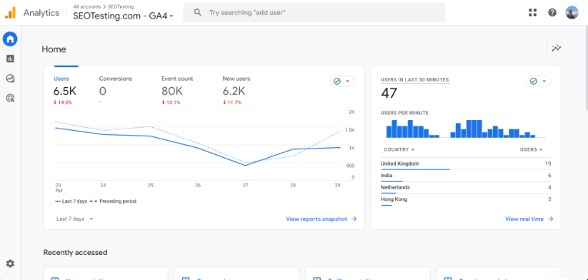 GA4 内でエンゲージメント率を見つけるのは簡単です。 GA4 ダッシュボードから始めます。 次のようになります。