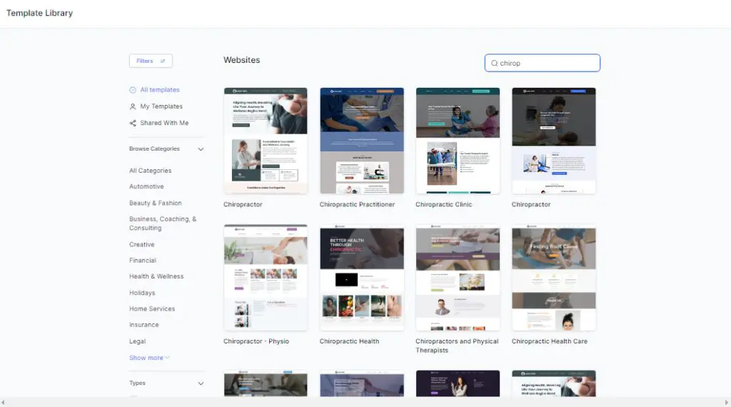 これを行うには、[サイト] タブに移動し、[新しい Web サイト] オプションを選択し、[カイロプラクター] テンプレートを選択します。