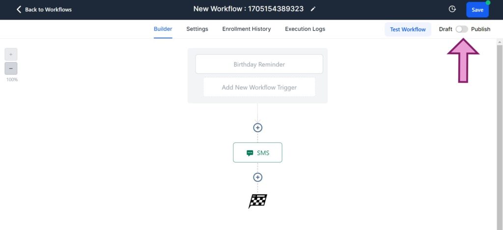 ![すべてのニーズが満たされたら、ワークフローを公開します。これを行うには、右上の [公開] トグルをクリックし、トグルを [公開] に移動します - Gohighlevel ワークフローを最初から作成する方法](/uploads/article/22968/bJIo0l7TH9w3qUcN.jpg)
