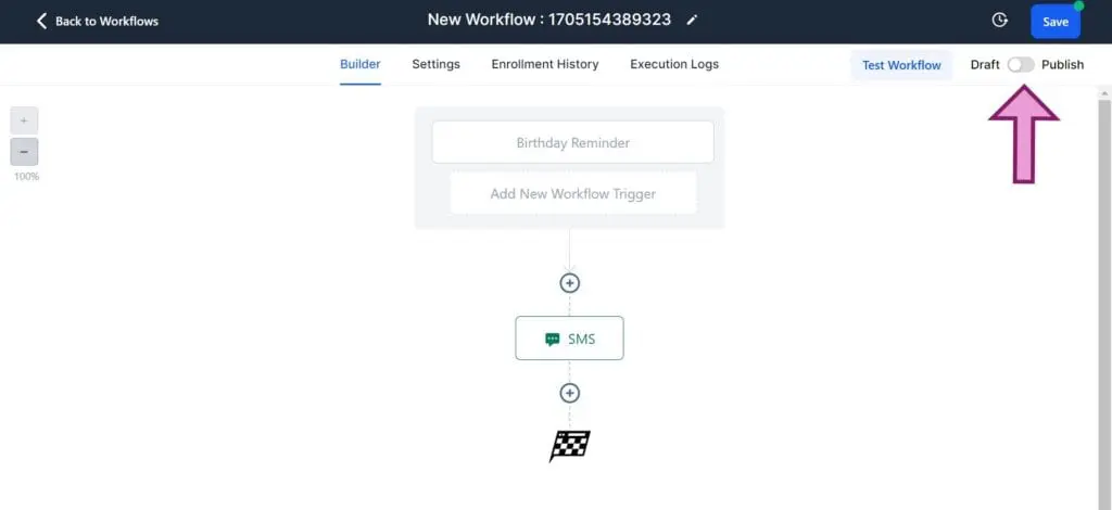 ![すべてのニーズが満たされたら、ワークフローを公開します。これを行うには、右上の [公開] トグルをクリックし、トグルを [公開] に移動します - Gohighlevel ワークフローを最初から作成する方法](/uploads/article/22829/HOTy1KcmADm9kv3w.jpg)