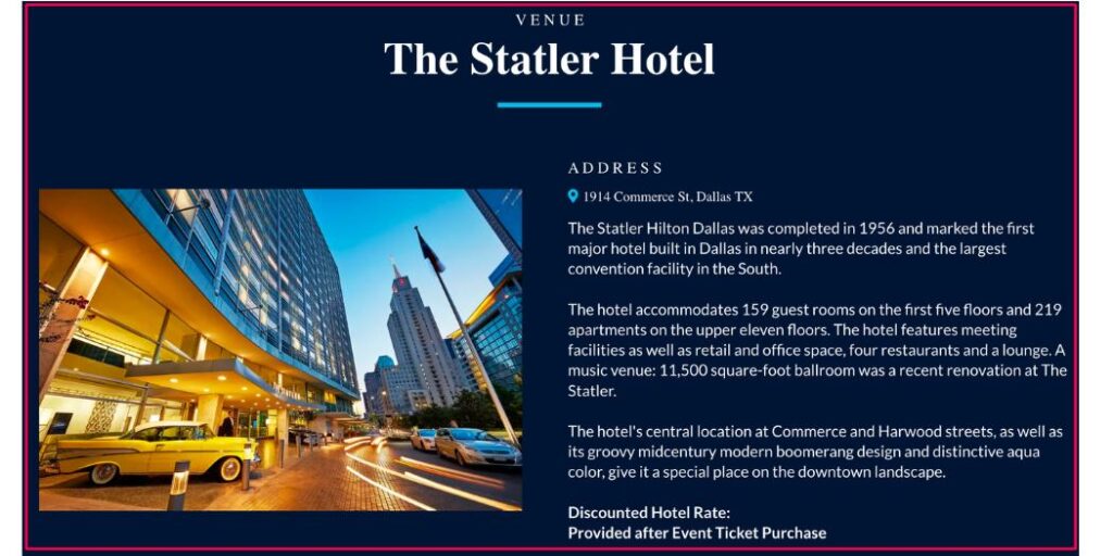 - 会場:スタットラー ホテル、1914 Commerce St、ダラス、テキサス州