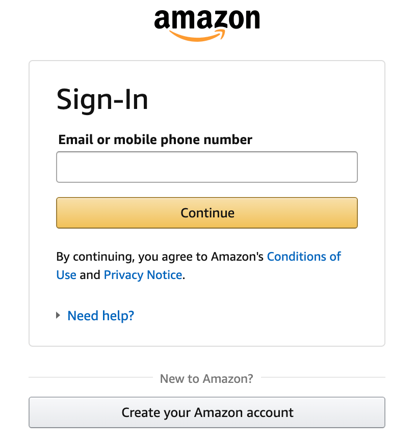 アマゾンはスペクトルの反対側に位置しています。 おそらく、評判のためか、毎分膨大な量の注文を処理しているという事実のためか、この巨人は顧客にアカウントを作成するよう要求しています。 ゲストとしてサイトを閲覧してカートにアイテムを追加することはできますが、2 番目にチェックアウトしようとすると、サインインまたはサインアップするオプションが表示されます。