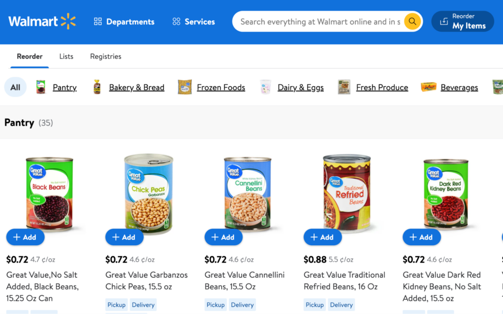 ウォルマートは、食料品をオンラインで購入する顧客の再注文プロセスを簡素化するという素晴らしい仕事をしています. 顧客アカウント内に、購入したすべての製品のリストに顧客を導く「マイアイテムの再注文」ボタンが提供され、ストアセクションごとに整理され、カートに追加するオプションがあります.