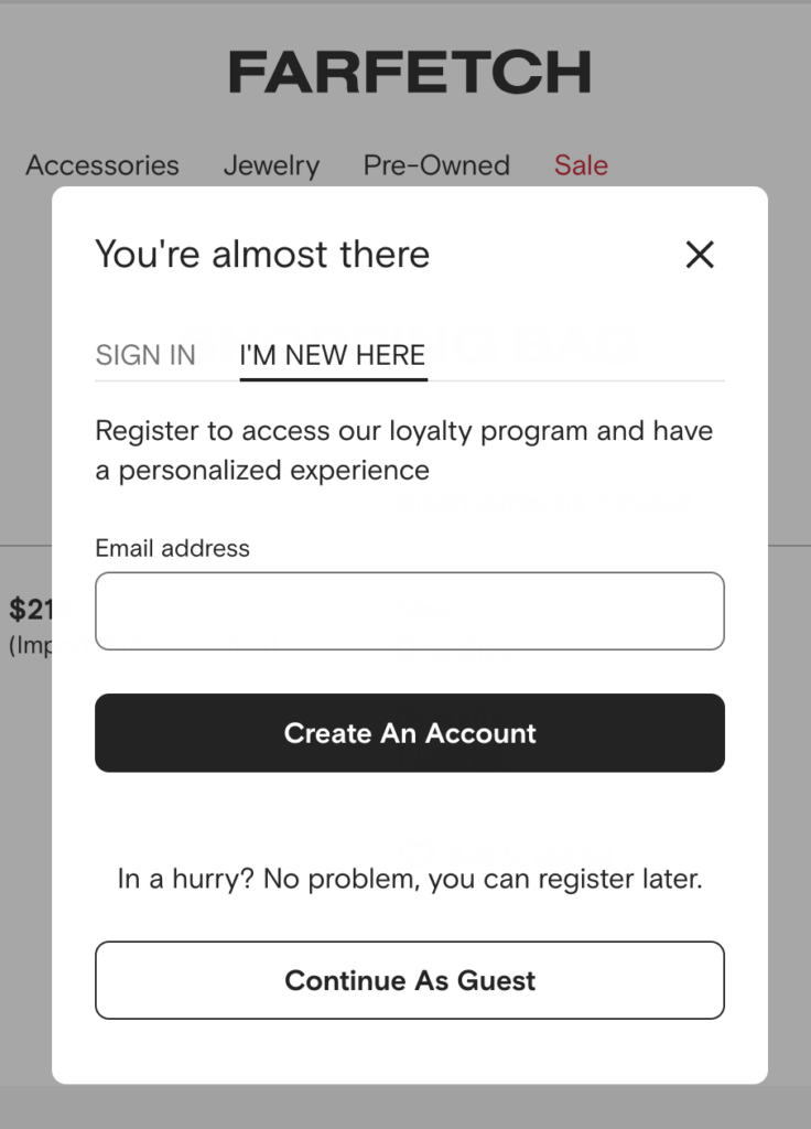 Farfetch と今後のゲスト チェックアウトの例との違いは、Farfetch がサインインまたはサインアップを優先することです。これらのオプションを最初に配置し、CTA をより暗い色で強調表示します。 「Continue As Guest」は、下の明るい CTA ボックスに表示されます。