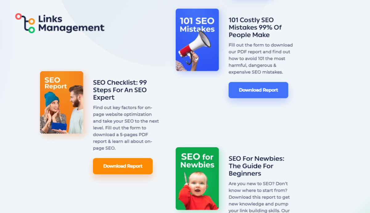 Web サイトへのすべてのリンクが同じ価値があるわけではないため、高品質のリンクを目指すことが重要です。 LinksManagement はさまざまなバックリンク オプションを提供し、無料の SEO PDF レポートを使用してバックリンクの分析と強化を容易にします。