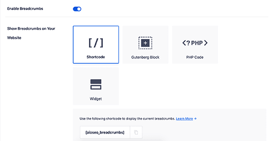 AIOSEOプラグインを使用すると、Gutenbergブログを挿入して、ブレッドクラムリンクを追加するだけで済みます。