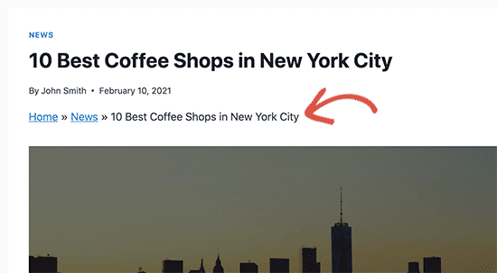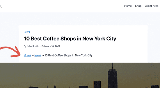 投稿を保存してプレビューし、どのように表示されるかを確認します。 下の画像は、ブレッドクラムのショートコードがWordPressサイトのフロントエンドにどのように表示されるかを示しています。