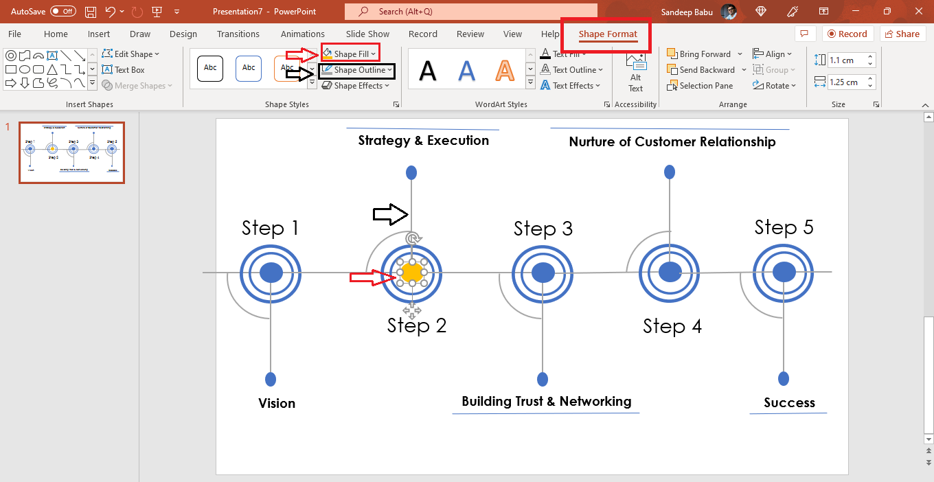 すべての要素の複製と調整が完了したら、線と形状の色を変更します。 ShapeFormatメニューをクリックします。 [図形の塗りつぶし]に移動し、適切な色を選択して、図形にその色を塗りつぶします。 [図形のアウトライン]タブから線の色を変更します。