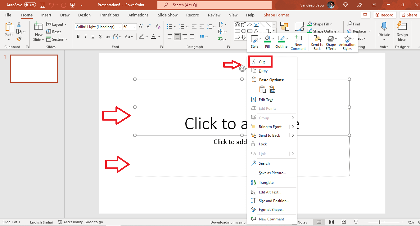 空白のスライドを開くと、プレゼンテーションのタイトルとサブタイトルを追加できる2つのテキストボックスが表示されます。 両方のテキストボックスを削除して、空白の白いプレゼンテーションスライドを作成します。