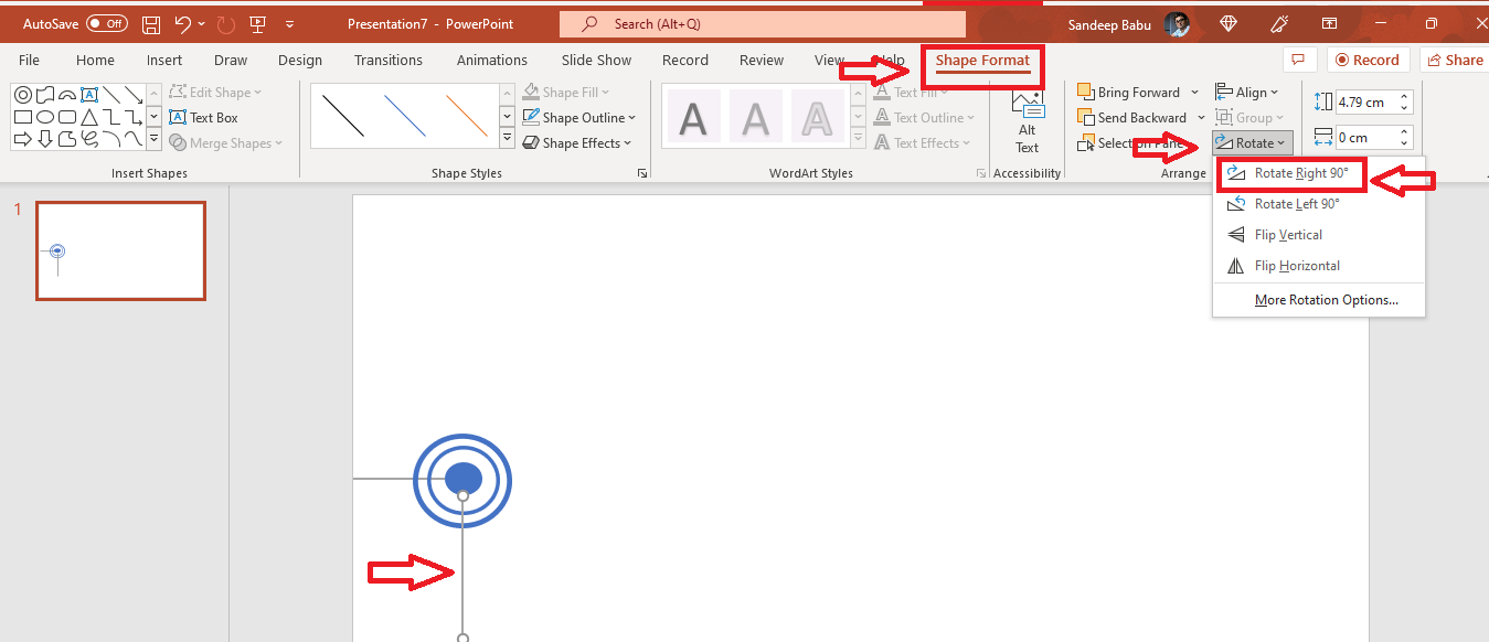 直線を選択して複製します。 [形状フォーマット]タブに移動し、[回転]をクリックします。 [右に90°回転]を選択します。 垂直線を中空の円の真ん中に配置します。 Shiftキーを押しながら、線のサイズを変更できます。