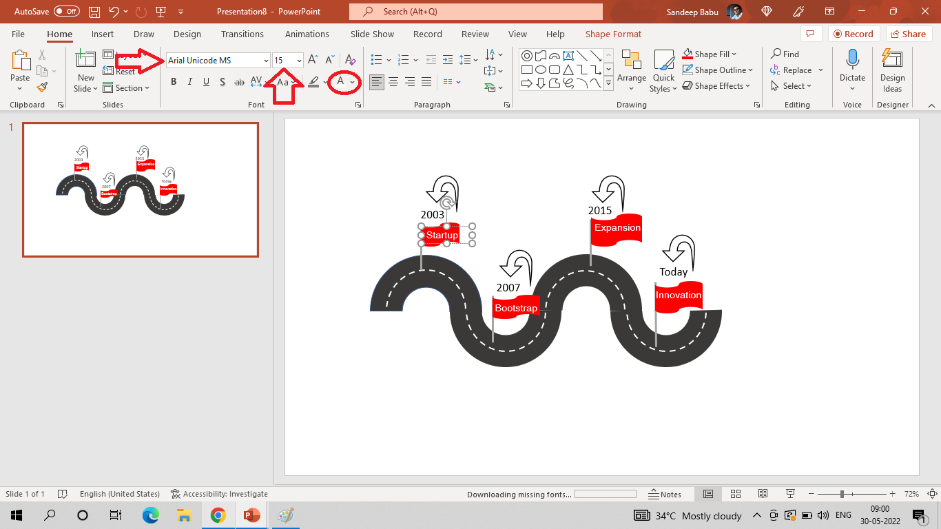 ロードマップに必要な数のテキストボックスを追加できます。 必要なテキストボックスをすべて追加したら、テキストを追加したり、フォントの種類、サイズ、色を変更したりできます。