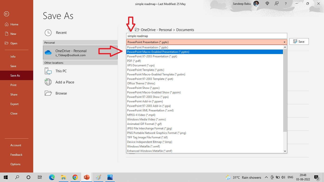 .pptm形式を選択してファイルを保存し、後で簡単に編集できるようにします。