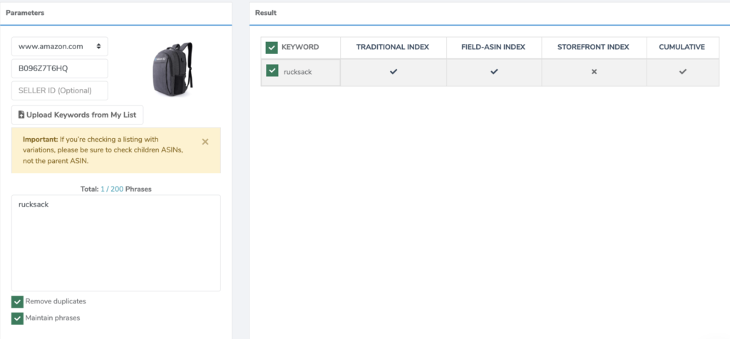 「セラーセントラルでは表示されないので、このリストビルダーの主題が機能するかどうかをどうやって知ることができますか?」 さて、それをテストしましょう。 この素晴らしいツールが実際に機能することを示すために、Listing Builderを使用して主題に「リュックサック」という単語を入れますが、リストのどこにも入れません。 この単語に対してツールのインデックスチェッカーを実行して、インデックスが付けられているかどうかを確認しましょう。 ビオラ!