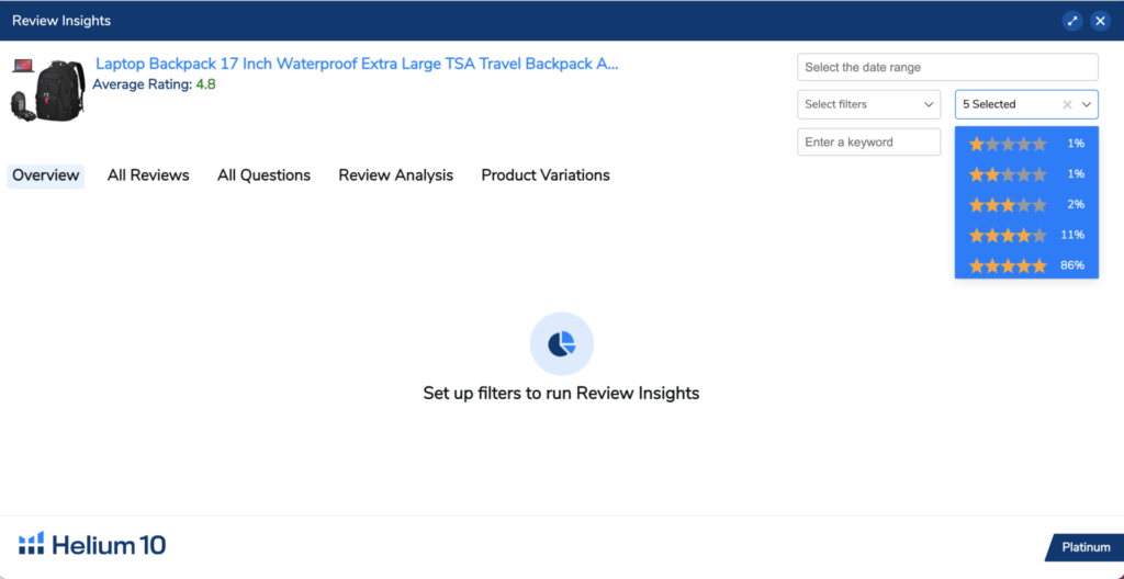 箇条書きに移る前に、コピーライティングを強化するために、戻ってさらにキーワード調査を行いましょう。 繰り返しになりますが、私があなたに手元に置いておくように頼んだそれらの10のASINを使用します。 各ASINを一度に1つずつ取得し、amazon.comに入力します。 各ASINで、 Review Insights (Helium 10 Chrome拡張機能内にあります)を実行します。 評価フィルターのすべてのオプションを選択し、レビューを抽出して、使用頻度の高いフレーズを見つけます。