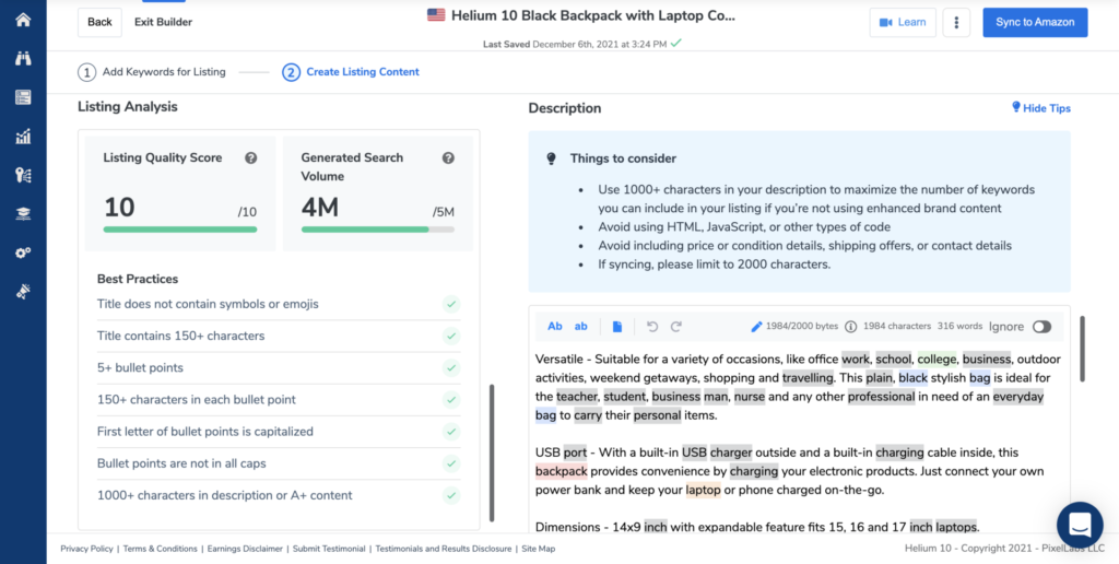 バックエンドのコピーが完成したら、写真撮影を計画して写真を撮ります。 写真の準備ができたら、リスティングビルダーに戻ってリスティングを公開する必要があることに注意してください。 リストを公開するには、ページの右上隅にある[Amazonに同期]ボタンをクリックします。 これではリスティング画像を同期できなくなるため、SellerCentralで個別に同期する必要があります。 それに進む前に、コピーを完成させて、完璧であることを確認したいと思います。