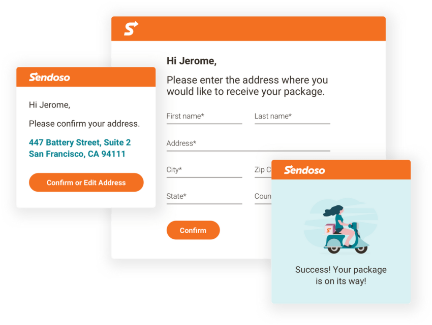 国際的な住所は、最も熟練したダイレクト マーケティングの専門家でさえつまずく可能性があります。 Sendoso の住所確認機能は、住所の問題を修正し、受取国に基づいてギフトに必要な追加の住所情報を収集するのに役立ちます。 受領および出荷通知のエラーについてお客様と協力して、必要な場所に在庫をより迅速に配置します。