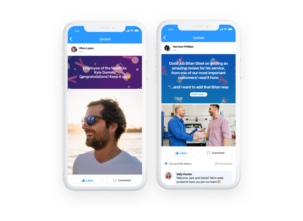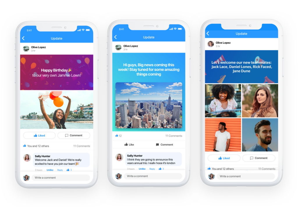 - ソーシャル フィードを使用して、トップの従業員を認識したり、会社の最新情報やイベントを投稿したり、同僚が投稿にいいね! したりコメントしたりできます。