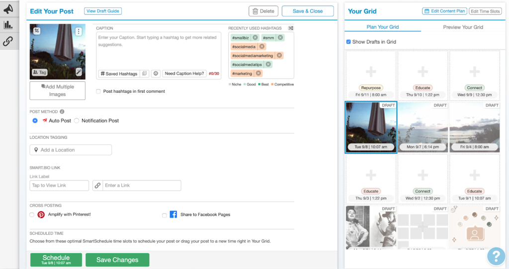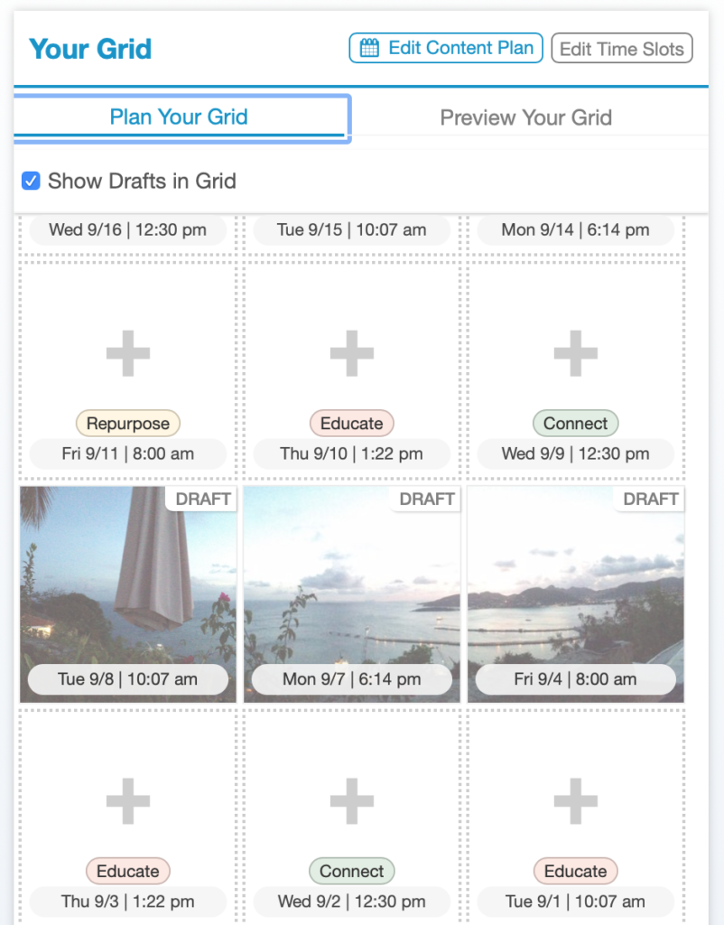 画像が投稿される日を変更したい場合は、グリッドプランナーの正しいスロットに画像をドラッグアンドドロップするだけです。 最良の部分は、投稿時間がスマートスケジュールで視聴者向けにすでに最適化されていることです!