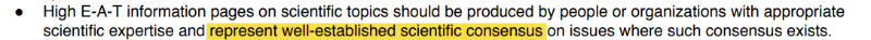 これらのサイトのそれぞれに共通していることの1つは、一般的な科学的コンセンサスと矛盾する可能性のある主題をカバーしていることです。 品質評価者ガイドライン(QRG)は、評価者に以下を評価するように指示します。 これは、EATに関するガイドラインのセクション3.2からのものです。