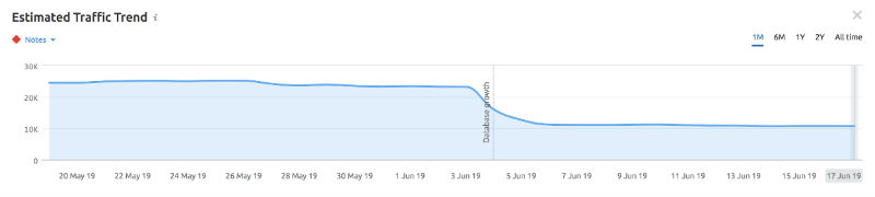 ご覧のとおり、ダイバーシティの更新は、影響を受けたサイトのトラフィックに大きな影響を与えませんでした。 私たちは当初、Yelpが最初のページで複数の位置を占めることが多いことを考えると、Yelpのようなサイトでドロップが発生するのではないかと考えていました。 SEMRushによると、Yelpは実際に6月上旬に増加しました。