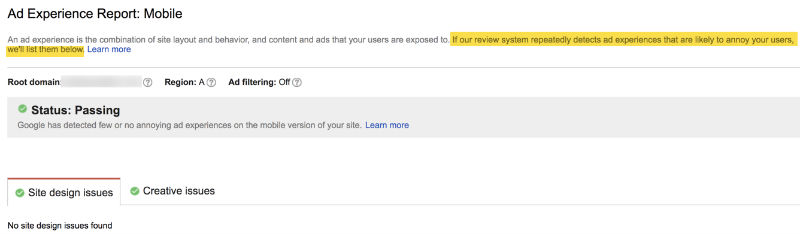 広告体験レポートで成績が不合格のサイトはまだありません。 ただし、アグレッシブな広告、特に最近更新されたQRGの変更として議論されたインタースティシャルの使用が原因でドロップが発生する可能性がある場合は、このレポートを確認する価値があります。