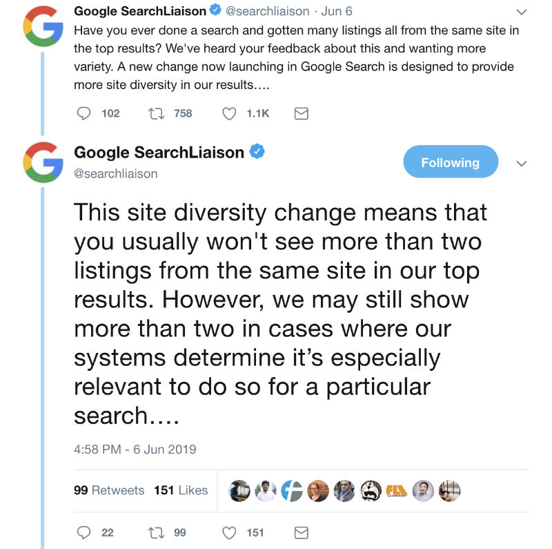 Googleがアップデートに関する詳細情報を提供してくれることに興奮していますが、6月のコアアップデートの実行と同時に、ダイバーシティアップデートと呼ばれる2番目のアップデートがプッシュされたのを見て非常に驚きました。