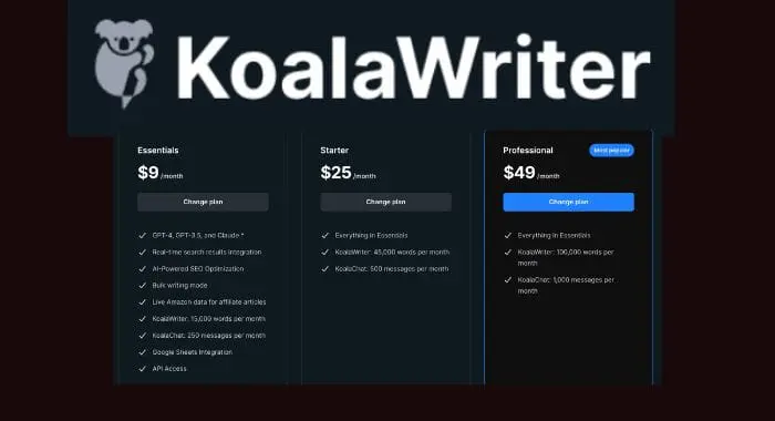 Koala Writer は、個人または小規模チームであれば非常に手頃な価格から始まるEssentials プランを提供しています。