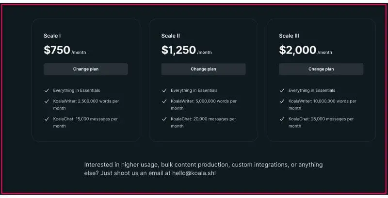 さらに、 Scale I Planのような Koala Writer の上位価格プランは、月額 2,500,000 ワードまで制限が増加した大量のコンテンツ作成が必要なユーザーを対象としており、月額最大 750 ドルとなるかなりの投資となる可能性があります。