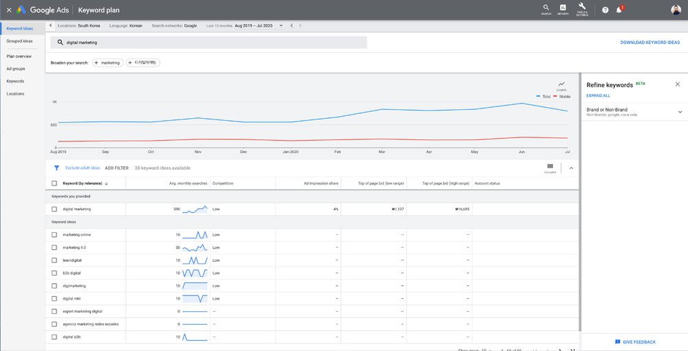 一方、グーグルは単語認識の面で利点があります。 キーワードプランナーを使用すると、一度に最大10個のキーワードを使用できます。 そうすれば、単語のつづりや間隔が間違っていても(たとえば、「Kirean DigitalMrketing」や「KoreanDigitalMarketing」)、Google Adsはユーザーの意味を認識しますが、NaverAdsは認識しません。