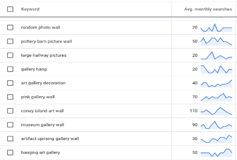 たとえば、ギャラリーの壁は人々の家でますます人気が高まっていますが、未開拓のコンテンツの機会があります。 カスタムギャラリーウォールサービスを提供したり、独自のギャラリーウォールを作成する方法についてのチュートリアルを提供したりすると、「ランダムな写真のウォール」や「ピンクのギャラリーウォール」などのキーワードでランク付けできる可能性があります。