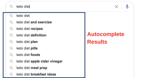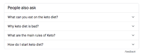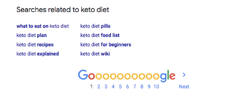 たとえば、ブラウザに「ケトダイエット」と入力すると、ロングテールキーワードと見なされる可能性のあるさまざまなアイデアが得られます。