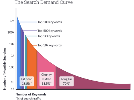 これらの人気のある単純なキーワードは、検索需要曲線の「ファットヘッド」に表示されます。 ただし、SEOの取り組みで実際に針を動かすのは、この曲線の最後に表示されるロングテールキーワードを使用してコンテンツとブログ投稿を作成することです。