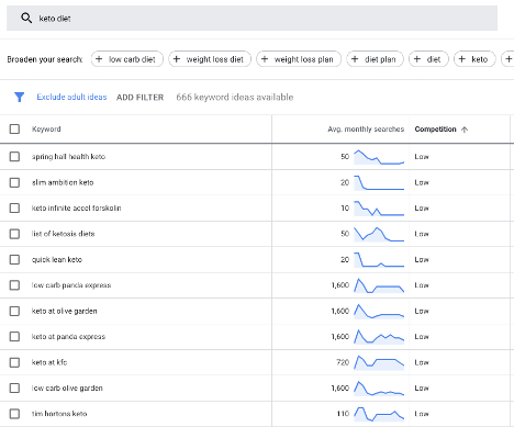検索ボリュームが少なく、競争が少ないフレーズに集中できるように、競争で並べ替えます。 ここでは、「オリーブガーデンのケト」、「ihopのケト」、「kfcのケト」などのキーワードフレーズの競争が少ないことがわかります。 あなたのウェブサイトがケトダイエットに関するものである場合、人気のあるレストランでケトを食べる方法についてのブログ投稿シリーズを作成することにより、多くの検索トラフィックを引き付けることができます。