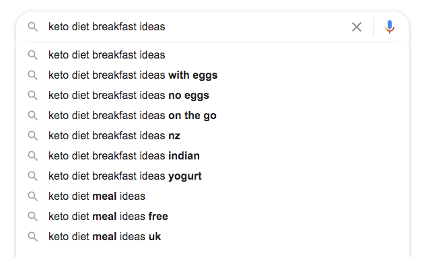 追加のフレーズを拡張するロングテールキーワードを見つけることで、これをさらに一歩進めることもできます。 たとえば、検索バーに「ケトダイエット朝食のアイデア」と入力すると、さらに多くのインスピレーションを得ることができます。
