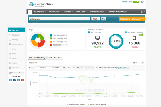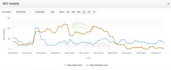全体的なリストから、コンテンツマーケティングファネルの各フェーズのコンテンツの種類とデジタルアセットの品質を確認できます。 スプレッドシートにパッケージ化したデータに加えて、全体的な可視性を確認し、競合他社と比較することもできます。 これは、あなたとあなたの競争相手が勝ち負けているパターンを特定し、あなたがあなたの競争相手をしのぐために埋めることができるギャップを見つけるのに役立ちます。 Searchmetrics Suiteを使用すると、競合他社間の可視性を比較できます。 このグラフでは、昨年のマットレスプロデューサーHelixSleepのブログの横にあるCasperのブログのパフォーマンスを確認できます。
