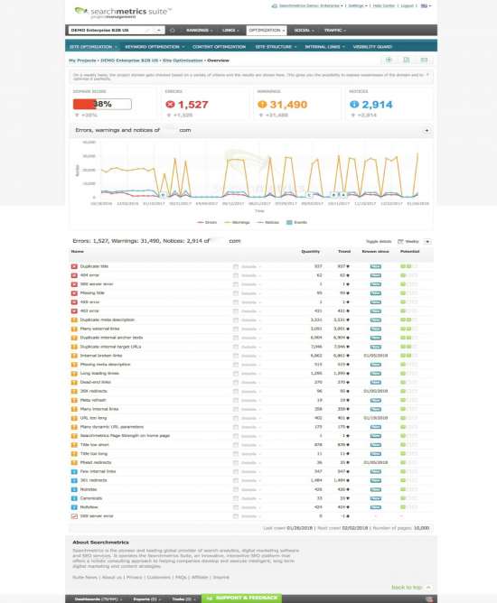 Searchmetricsは、カエルの叫び声よりも採用しやすいサイトクローラーサービスも提供します。 以下は、Searchmetricsがクロールを実行した後の主要なソフトウェア会社のエラーの画像です。