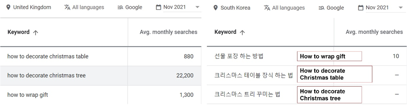虽然「クリスマスツリーの飾り方」(どのように装饰圣诞树)や「ギフトの包み方」(礼物をどのように包装するか)など长尾搜索词在英语(英国)ではより高いMSVを持っていますが、韩语ではこれに該当しません同時に、会話中の「カウンセラー」や「カウンセラー」などの短いキーワードの方がはるかに多い。