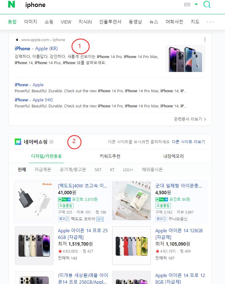 ネイバーサービスは、SERP 上の位置は固定されていません。逆に、ユーザーの検索リクエストに基づいています。たとえば、iPhone を検索すると、レポートの後に Apple 公式ネットと Naver ショッピングが表示されます。 SEO」のとき、報道の次の前2位はNaver百科事典と言辞辞典です。