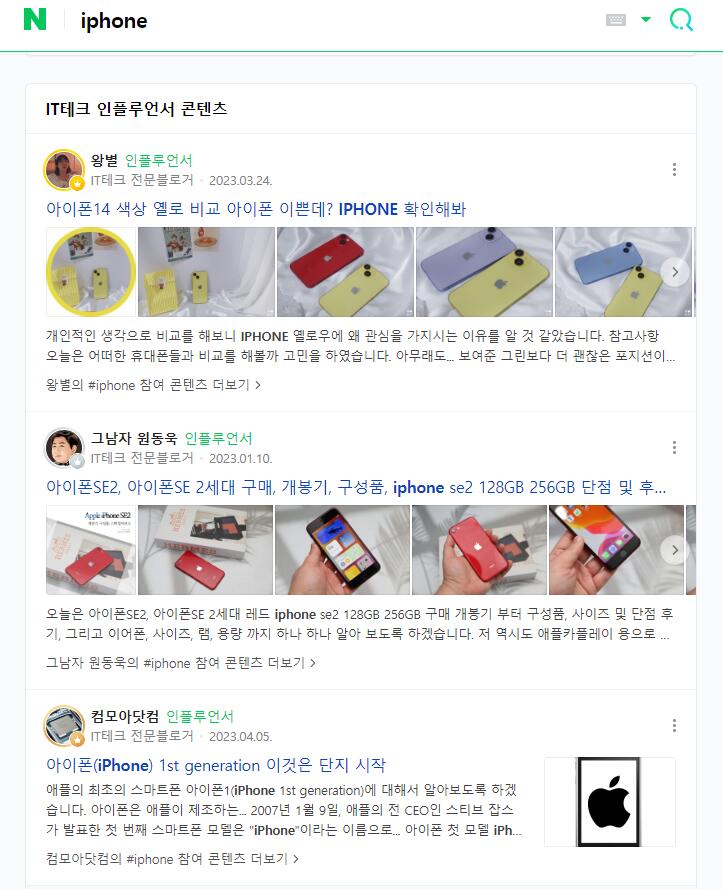たとえば、下の図では、「iPhone」を検索したときに、Naver が IT 業界の知性を持っていると認めているブログの文章が表示されています。