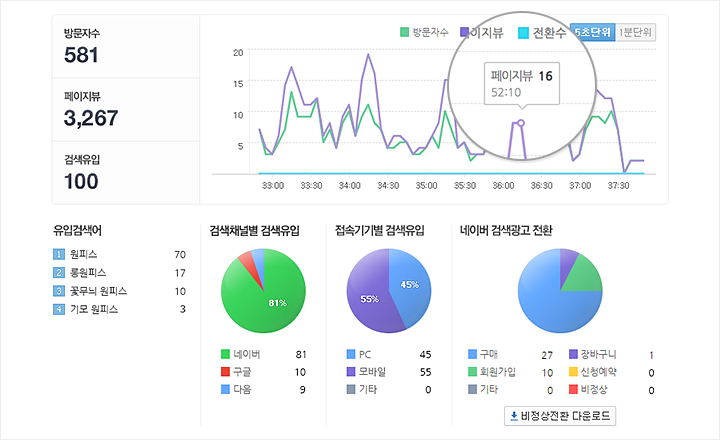 その後、Naver Analytics を使用して、これらの文章やブログのユーザーの最も人気のあるメッセージを閲覧し、ユーザーがアクセス時にこれらの検索コメントを入力したことを確認できます。