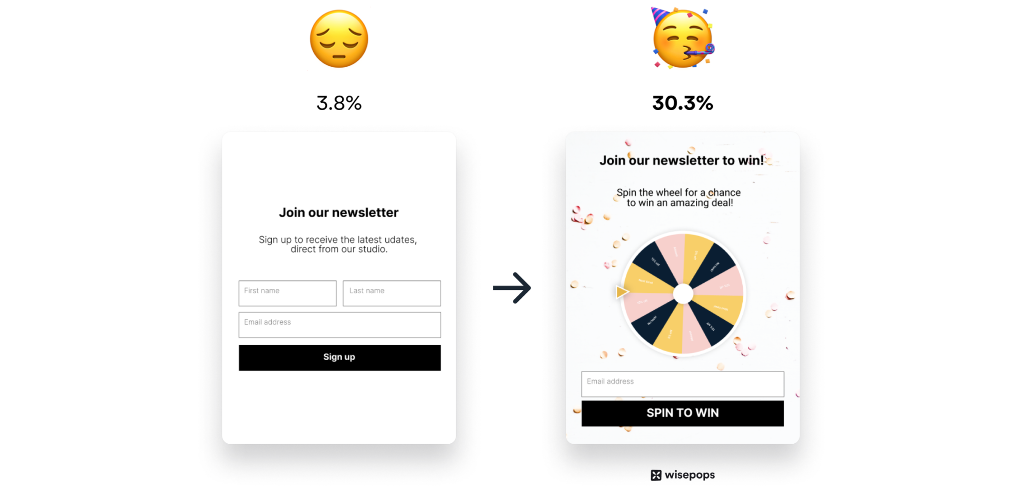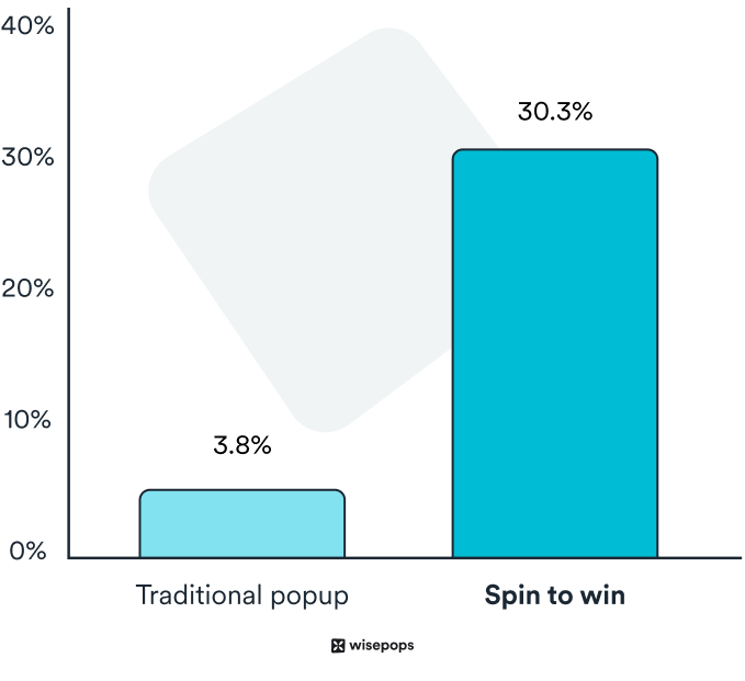 スピン トゥ ウィン ポップアップと従来の電子メール サインアップ ポップアップの平均コンバージョン率を比較すると、前者のパフォーマンスは 30.33% 対 3.8% とはるかに優れています。