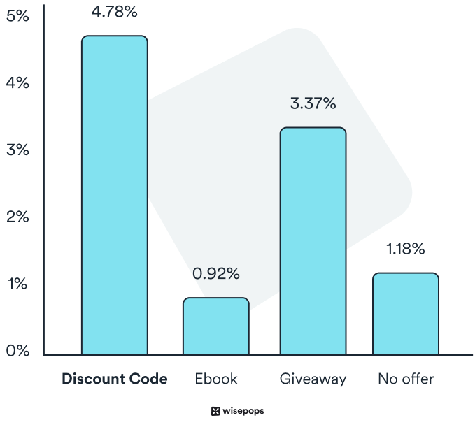 電子ブック (0.92%) や景品 (3.37%) などの他の人気のあるインセンティブは、より少ない訪問者に変換します。 この結果は、すべてのポップアップに割引を含める必要があることを意味するものではありません。