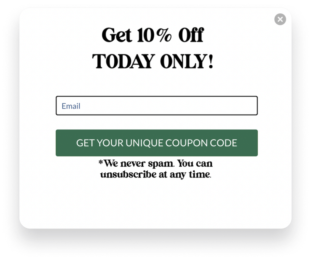 そのため、ポップアップを使用している場合は、キャンペーンをより魅力的にするために何らかのオファーを含めることを検討してください。 人気のあるオファーのリストには、割引、クーポン コード、無料製品、電子書籍、レポート、ウェビナー登録などが含まれます。