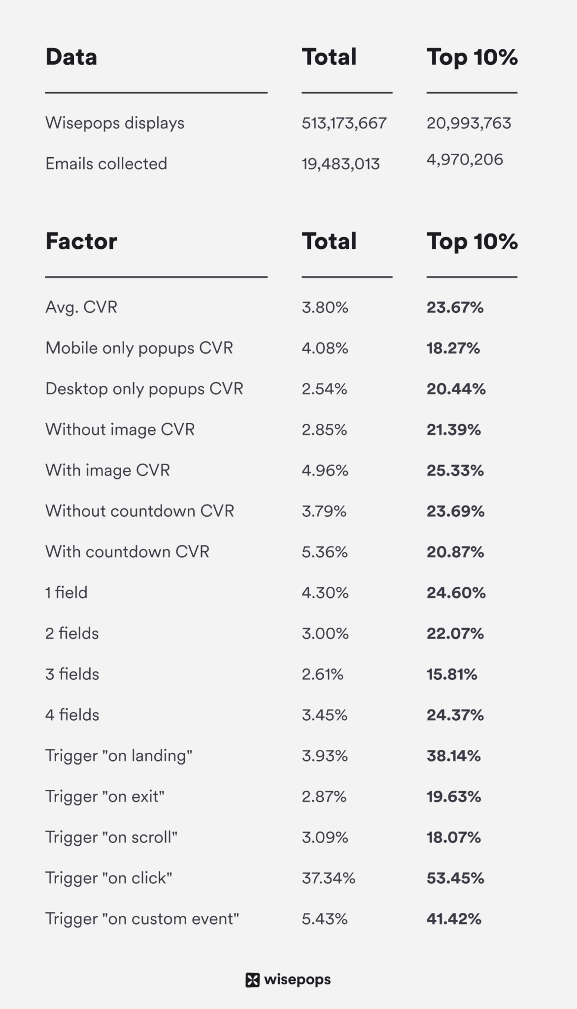 2021 年と 2022 年に Wisepops で作成された電子メール ポップアップ キャンペーンの 5 億 1,300 万回以上の表示をスキャンしたため、このことがわかります。サンプル全体のさまざまな要因の平均 CVR を計算し、キャンペーンの上位 10% からデータを区別して、それを示しました。ベスト プラクティスを使用することで成果が得られます。