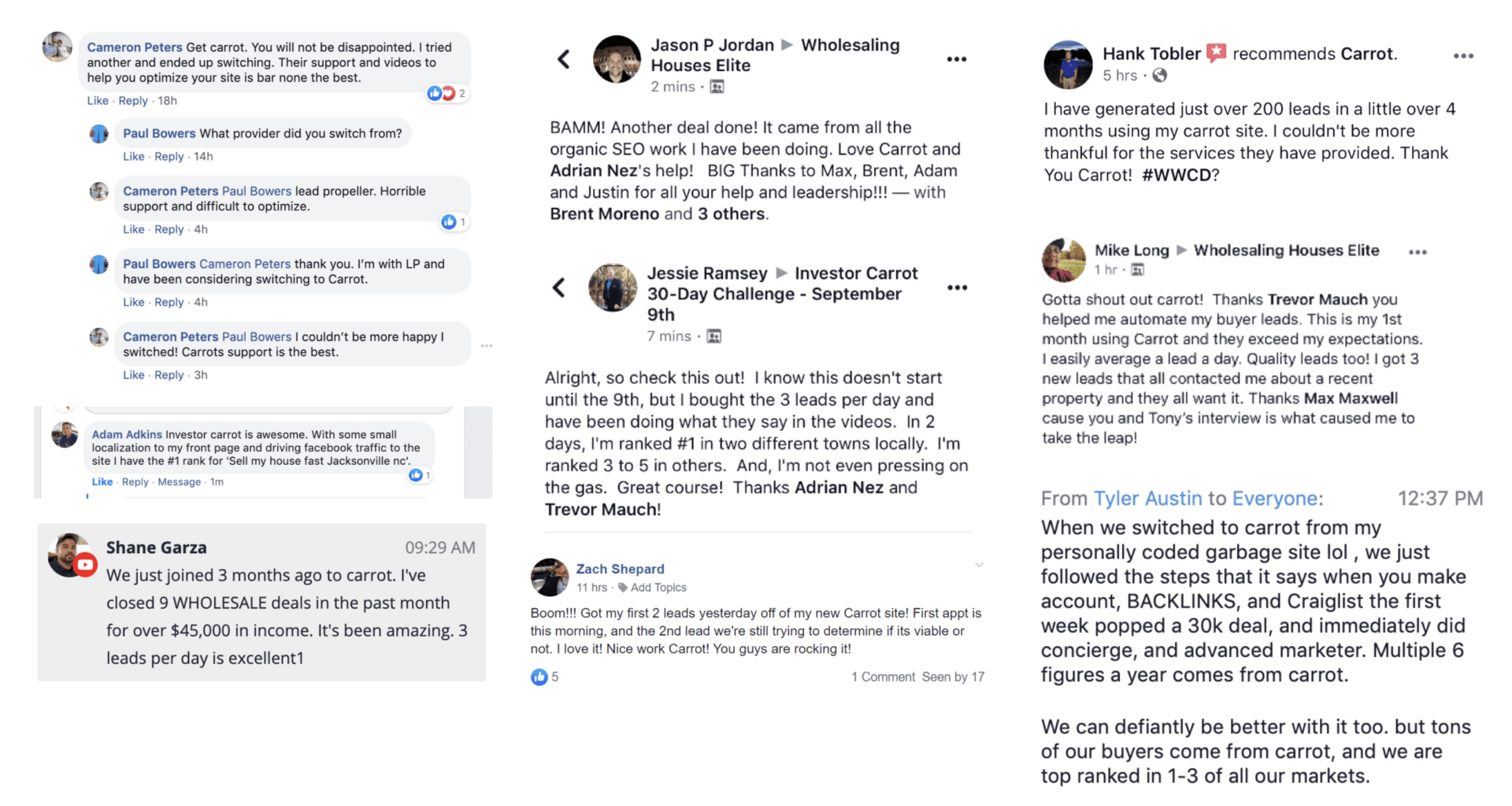 完全に開示すると、あなたはキャロット ブログに掲載されています…そして私たちは、そこにあるオプションが不動産投資家のニーズを満たしていないと感じたため、Web サイト システムを作成した (不動産投資家によって設立された) 会社です。 しかし、そうは言っても、私たちは人々を「騙して」私たちのサービスに参加させるつもりはありません…なぜなら、私たちのサービスがすべての人に適しているわけではないことを知っているからです。また、率直に言って、私たちはすべての人と一緒に働きたいわけではありません。