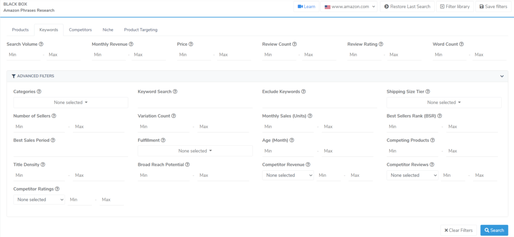 ブラックボックスの[キーワード]タブでは、検索を絞り込んで、需要が高く競争が少ないキーワード(私たちが話し合った機会)を見つけるのに役立ついくつかのパラメーターを設定できます。 これらのフィルターには次のものが含まれます。