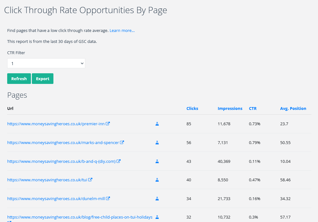 SEOTesting 内の「ページごとの低い CTR」レポートと同様に、このレポートは、ページ タイトルの最適化の機会をすぐに見つける簡単な方法です。 このレポートをインプレッション数 (最大から最小) で並べ替えるだけで、最大のプラスの影響をもたらすクエリが得られます。