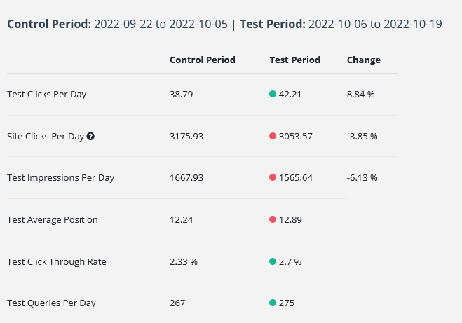 「ページのタイトルと説明をテストすることは、私にとって大きな成果でした。最終的には平均掲載順位がプラスに動くことを確認することを目的として、CTR を高めたいと考えていました。SEO テスト データを通じてキーワードとフレーズを調査し、本当に改善したい用語を特定しました。 CTR. 意図を持って書きましたが、メタディスクリプションについても少し違うことをしました. 通常、私は「セールス」の方法でそれらを書き、人々がページにクリックするように誘導しますが、代わりに、(意図とユーザーが入力したキーワードに基づいて Google がそれらを書き直すことなど)、定義として、または私が最適化しているキーワードに基づいて Google がページから引き出すことを期待するものとして書きました。」