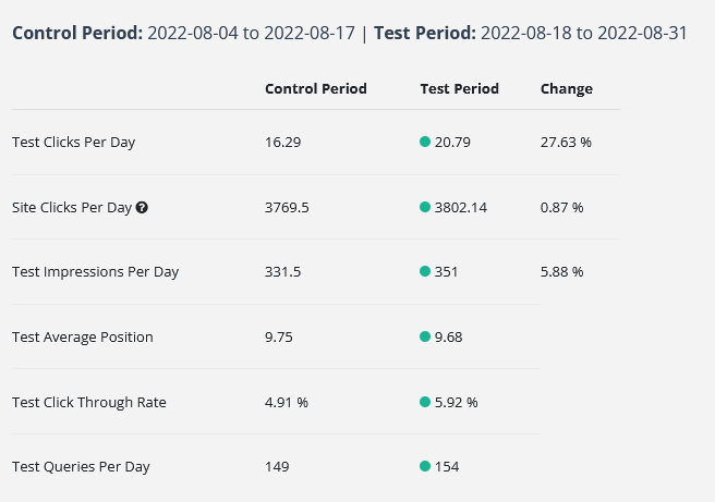 SEOTesting のページあたりのトップ クエリ レポートを使用して、ページがランク付けされたインプレッションの高いキーワードを特定しました。 次に、これらのいくつかをページ タイトルに含めることで、追跡可能な各テスト メトリックで良好な結果が得られました。