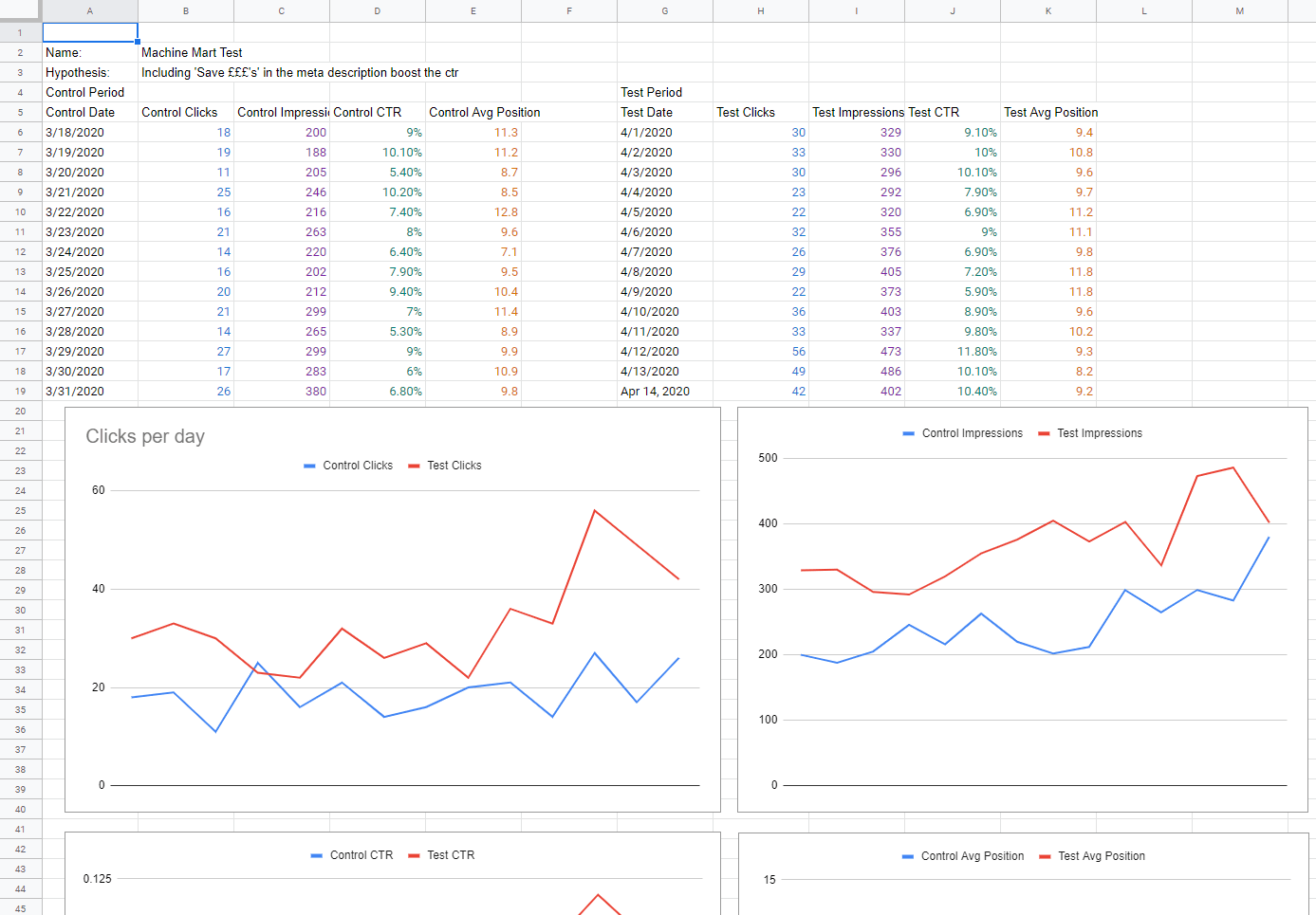 また、Google Sheets、Microsoft Excel、Apple Numbers などの表計算ソフトウェアへのアクセスも必要です。 これは、毎日のインプレッション、クリック、およびクリックスルー率のデータを書き留めて、テスト期間の終わりに戻ってきて、テストが成功したかどうかを確認できるようにするためです. また、テスト シート内の事前構成済みフィルターを使用して、関連する Search Console プロパティにリンクする必要があります。